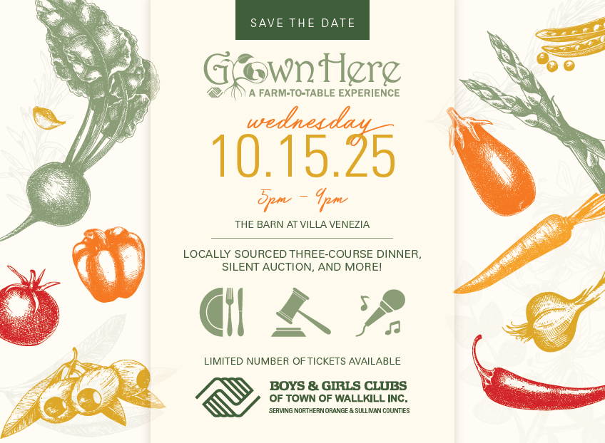 We are pleased to announce the 10th Annual Grown Here! Join us on Wednesday, October 15th, 2025 at The Barn at Villa Venezia as we come together to wine and dine on everything that is Grown Here in the Hudson Valley.